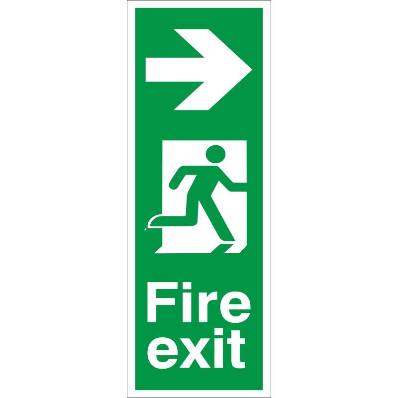 A Fire Exit with Arrow Right Sign indicates a direct route to an emergency exit, guiding individuals to move straight ahead for safe evacuation.