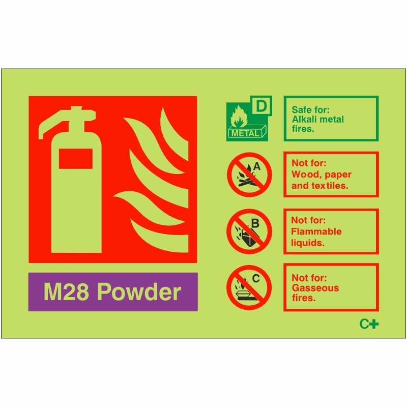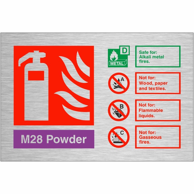 This Powder M28 Fire Extinguisher ID Sign is 150mm x 100mm and is used to identify L2 Powder Fire Extinguishers. It reminds you that L2 Powder Fire Extinguishers can be used on Alkali Metal Fires but not Wood and paper textile, Flammable liquids, or gasseous fires.